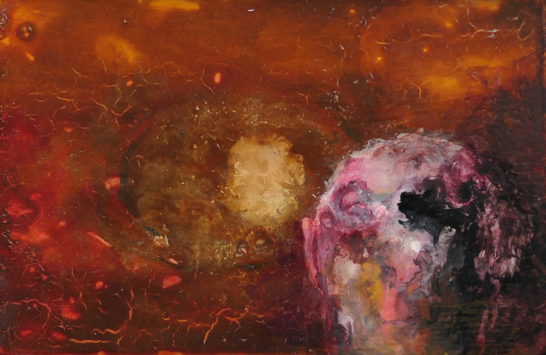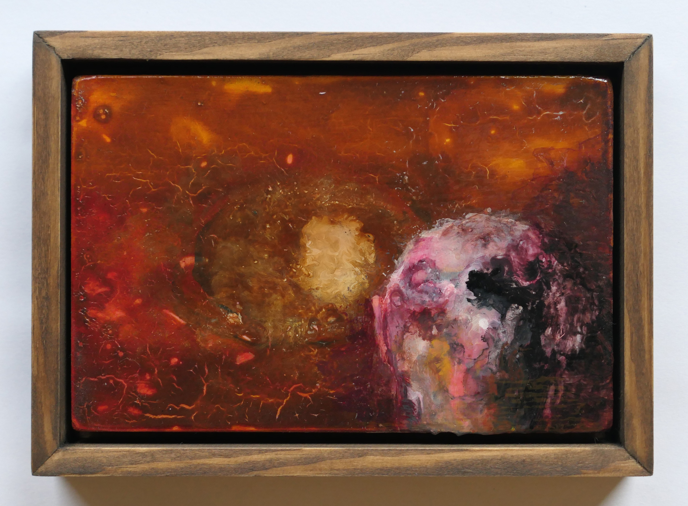 Daniel H Bell, Sun, 2023, Acrylic, wood stain, fake blood, varnish and gel on MDF, (12x8 cm) 14x10 cm framed